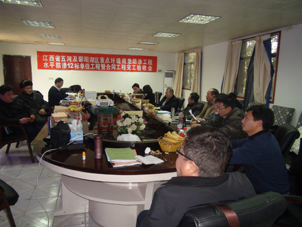 2012年1月10日,江西省五河及鄱陽湖區(qū)重點(diǎn)圩堤應(yīng)急防滲工程建設(shè)項(xiàng)目部在江西省共青城市主持召開了水平防滲12標(biāo)單位工程暨合同工程完工驗(yàn)收會(huì),并順利通過了單位工程暨合同工程完工驗(yàn)收。驗(yàn)收會(huì)由省河湖局許盛豐主持。公司吳鐵凡總工程師、工程部郭洪有經(jīng)理參加了驗(yàn)收會(huì)。