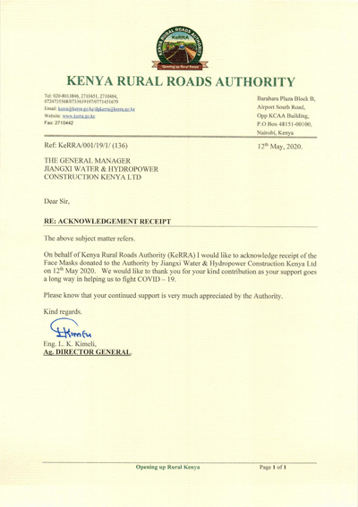 收到來自江西水建捐贈(zèng)的防疫物資后,肯尼亞鄉(xiāng)村公路局局長由衷地表示感激,并向肯尼亞分公司寫了一封感謝信,他在信中表示:“江西水建友好慷慨的捐贈(zèng),將為我們對(duì)抗新冠肺炎疫情提供長遠(yuǎn)的支持,肯尼亞鄉(xiāng)村公路局對(duì)此深表感激。”