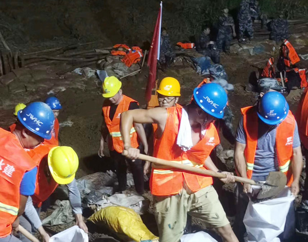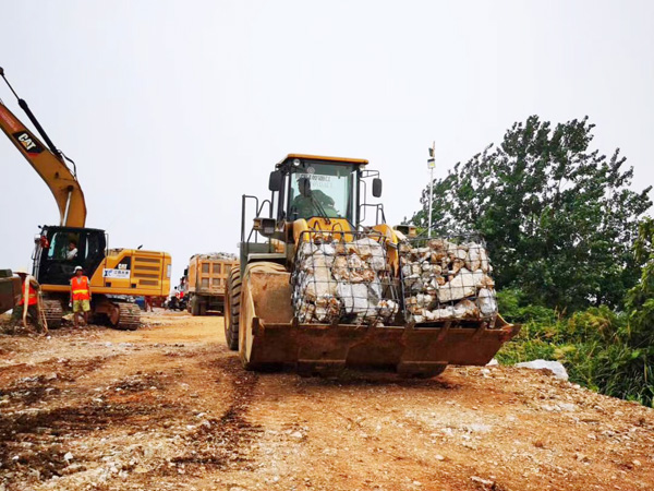 7月14日14時,封堵作業正式啟動,南北兩岸同時進占施工。然而,困難層出不窮:道路不平,存在積水,影響車輛通行;一線搶險人員的生活保障還不夠完善,吃住條件艱苦,防雨防曬防蚊設施簡陋,無便攜照明設施;砂石骨料耗量巨大,但存在配額限制,獲取來源較少。但現場人員攻堅克難,積極與政府、當地及偏遠廠商溝通,解決了人員基本需求和石料問題,并在當日順利鋪石20米,邁上堅實的第一步。