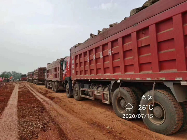 7月15日凌晨,貨車連夜運送石料入場,現場材料調度人員徹夜不休,僅借助貨車大燈照明,順利完成調度工作。當日,決口成功封堵70米。