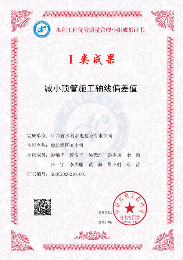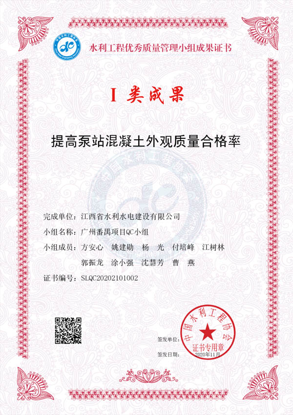 其中:廖坊灌區(qū)QC小組編寫的《減小頂管施工軸線偏差值》獲I類成果獎、廣州番禺項目QC小組編寫的《提高泵站混凝土外觀質(zhì)量合格率》獲I類成果獎、廣州增城項目QC小組編寫的《降低邊坡襯砌砼表面質(zhì)量缺陷率》獲III類成果獎。