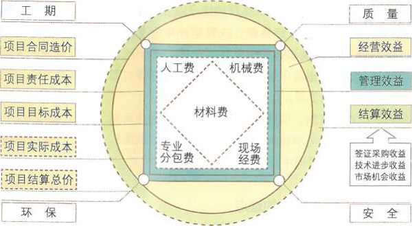 的關系。“接項目”確定了合同造價,對應方圓圖的實線圓;“做項目”的第一步是下達項目目標責任書,確定項目責任成本,對應方圓圖的責任成本方形,第二步分子公司在責任書的基礎上進行項目實施策劃,產生項目的目標成本,對應方圓圖的目標成本方形,第三步就是項目實施過程的管控,最終確定實際成本,對應方圓圖的實際成本方形。“算賬收錢”就是完成項目過程中的結算變更與最后的決算收款,從而確定結算造價,對應方圓圖的結夢造價虛線圓。項目實施過程中進度、質量、安全、環保及周邊相關 方的管理對應成本方形的四個支撐頂點,構成成本的五項費用“材料、人工、機械、現場經費、專業分包”對應成本方形的內部區域。